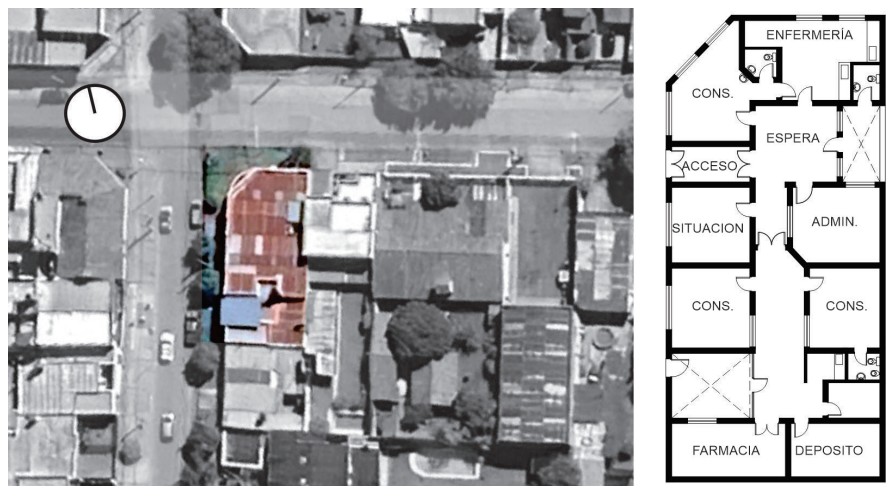Figura 1. Emplazamiento y planimetría del caso de estudio.En términos de distribución funcional, el CAPS cuenta con tres consultorios para distintas especialidades médicas, una enfermería, depósitos, una sala de admisión y una sala de reuniones. Los sanitarios están diferenciados para el uso del público y del personal. La circulación se organiza a través de un único acceso y un pasillo central que se divide en dos áreas, la segunda con un acceso más restringido. Ambos espacios de circulación funcionan como salas de espera. La materialidad del edificio se compone de muros exteriores de ladrillo cerámico macizo de 0.30 m de espesor, revocados en ambas caras. La cubierta consiste en una losa maciza con cielorraso aplicado, sobre la cual se ha instalado un sobretecho de chapa en algunos sectores para resolver problemas de filtración de agua. Los muros interiores también se resuelven con mampostería de ladrillo macizo, el piso es de granito reconstituido, colocado con mezcla de asiento sobre contrapiso.