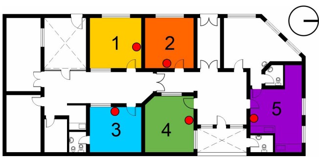 Figura 1. Ubicación de sensores térmicos en caso de estudio.El monitoreo higrotérmico del CAPS se realiza en los períodos críticos del año, uno frío y uno cálido, para caracterizar el comportamiento térmico del edificio. El estudio en el período frío se lleva a cabo del 7 al 17 de julio de 2022, y el monitoreo para el período cálido abarca del 17 al 30 de noviembre de 2022. En ambos casos, se registran los valores de temperatura interior en cada espacio, los cuales se correlacionan con la temperatura exterior de la estación meteorológica El Colmenar.