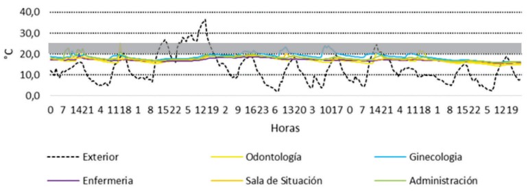 El gráfico consignado en la figura 2, exhibe los valores obtenidos para el periodo de invierno. En él, el análisis de los datos evidencia el efecto de amortiguamiento térmico que proporciona la masa de la envolvente edilicia. La inercia térmica de los muros de ladrillo cerámico de 0,30 m y la losa maciza permite que la edificación retrase y suavice las fluctuaciones de la temperatura exterior. Sin embargo, el monitoreo también advierte que, durante las horas de funcionamiento del CAPS, se activan sistemas de calefacción para mantener el confort interior, demostrando que la edificación combina el rol pasivo de la envolvente con el apoyo activo para lograr las condiciones de confort deseadas.