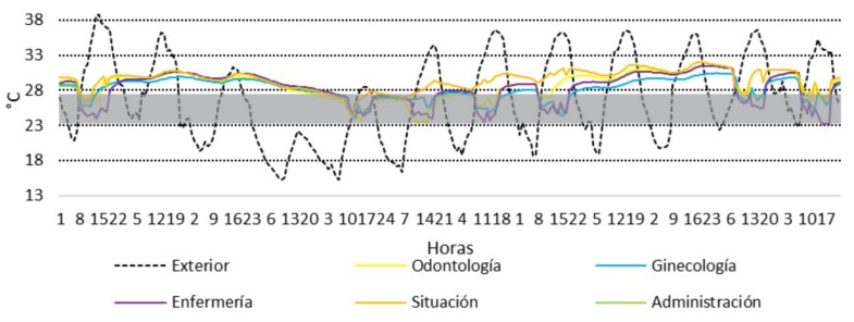 Figura 3. Valores de temperatura para el monitoreo higrotérmico en el período cálido.Confort térmico: El análisis de confort térmico para el período frío y el período cálido se basa en los mismos parámetros, consignados en el estándar ANSI-ASHRAE 55. Se consideran horas confortables, aquellas con un PMV entre -0,5 y 0,5 y un PPD menor al 15%.