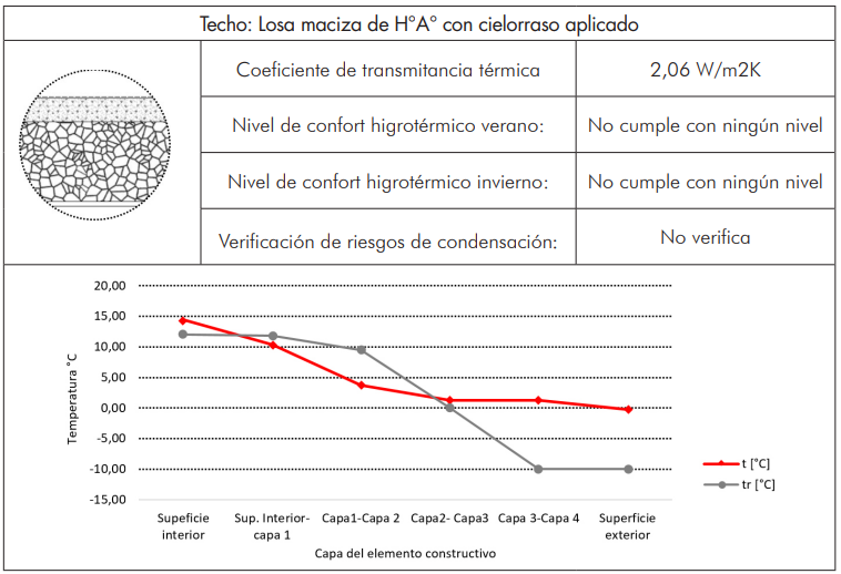 Comportamiento higrotérmico de la envolvente: Para evaluar el desempeño higrotérmico de la envolvente, se analiza el cumplimiento de lo establecido en normas IRAM. Para el caso del muro (tabla 1), se obtiene un coeficiente K de 1,96 W/m²K el cual no clasifica dentro de los niveles de confort higrotérmicos establecidos por IRAM 11605 para invierno ni para verano. A su vez, se observa la existencia de riesgos de condensación intersticial. La situación de la solución constructiva del techo resulta similar (tabla 2). Su coeficiente de transmitancia térmica no cumple con ninguno de los niveles establecidos por IRAM para invierno y verano. Se evidencia también, riesgos de condensación intersticial.