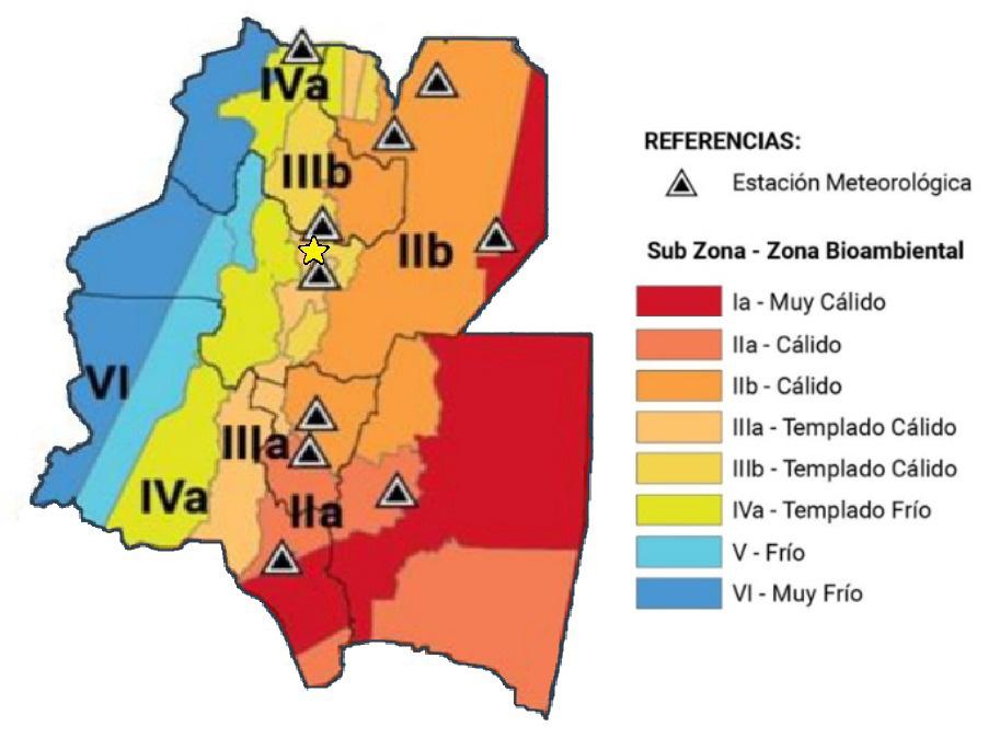 La Norma IRAM 11603 establece un marco de referencia que responde a las condiciones del sitio a través del diseño y la construcción que se adaptan al clima, la topografía y el bioma del lugar (Ministerio de Interior, obras públicas y vivienda, 2019). Argentina está dividida en seis regiones y en la provincia de Salta conviven todas las zonas. La localidad de Vaqueros, departamento La Caldera, se encuentra en la zona bioambiental IIIa, que se caracteriza por veranos calurosos e inviernos no muy fríos (Ente Nacional Regulador del Gas, 2021) (Figura 1).