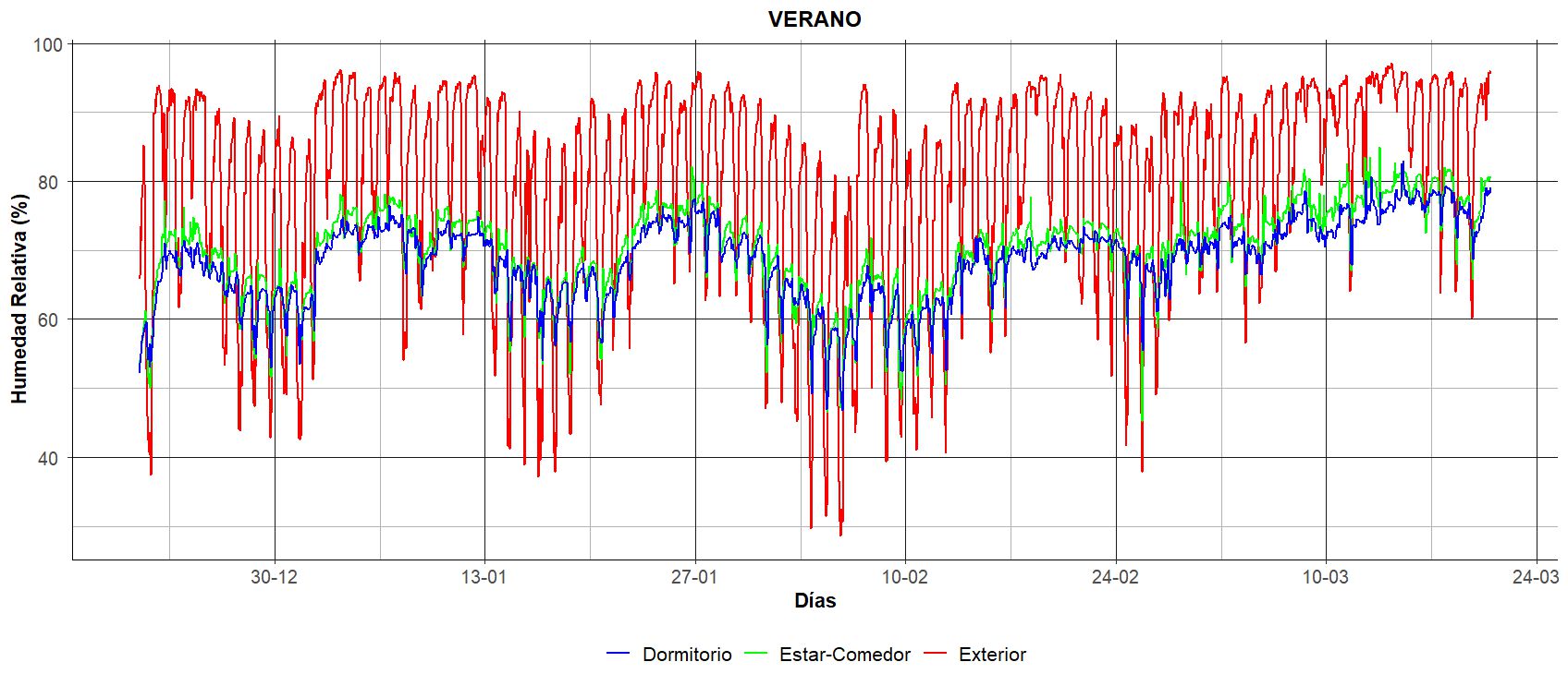 Figura 10: HR del exterior y de las distintas zonas del interior para el periodo del 21 de diciembre al 20 de marzo.El análisis del porcentaje total de horas en confort por estación (tabla 1) confirma el marcado comportamiento estacional de la vivienda. Se observa un rendimiento térmico óptimo en primavera y, especialmente, en verano, estaciones en las que se superó el 70% de horas en confort. Por el contrario, en invierno este porcentaje fue inferior al 25%, aun incluyendo los momentos con uso de sistemas de calefacción por parte de la usuaria.