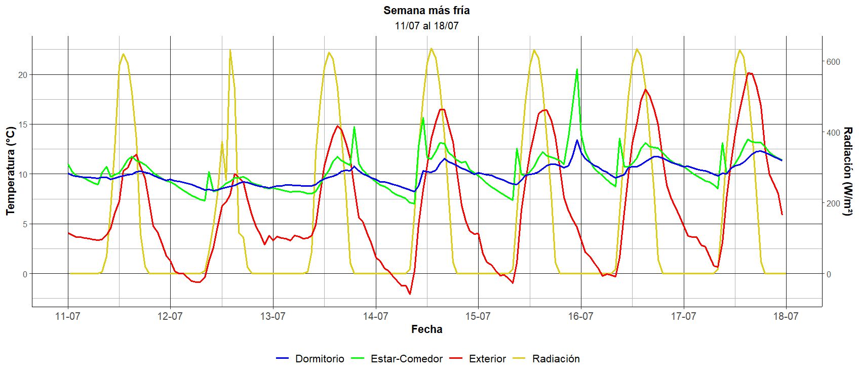 Para profundizar en estos resultados, se analizaron en detalle dos semanas representativas, una de invierno y otra de verano. Durante el periodo del 13 al 18 de julio, la semana de invierno (Figura 11), se observa una clara coincidencia entre los picos de radiación solar y los momentos de mayor temperatura exterior.