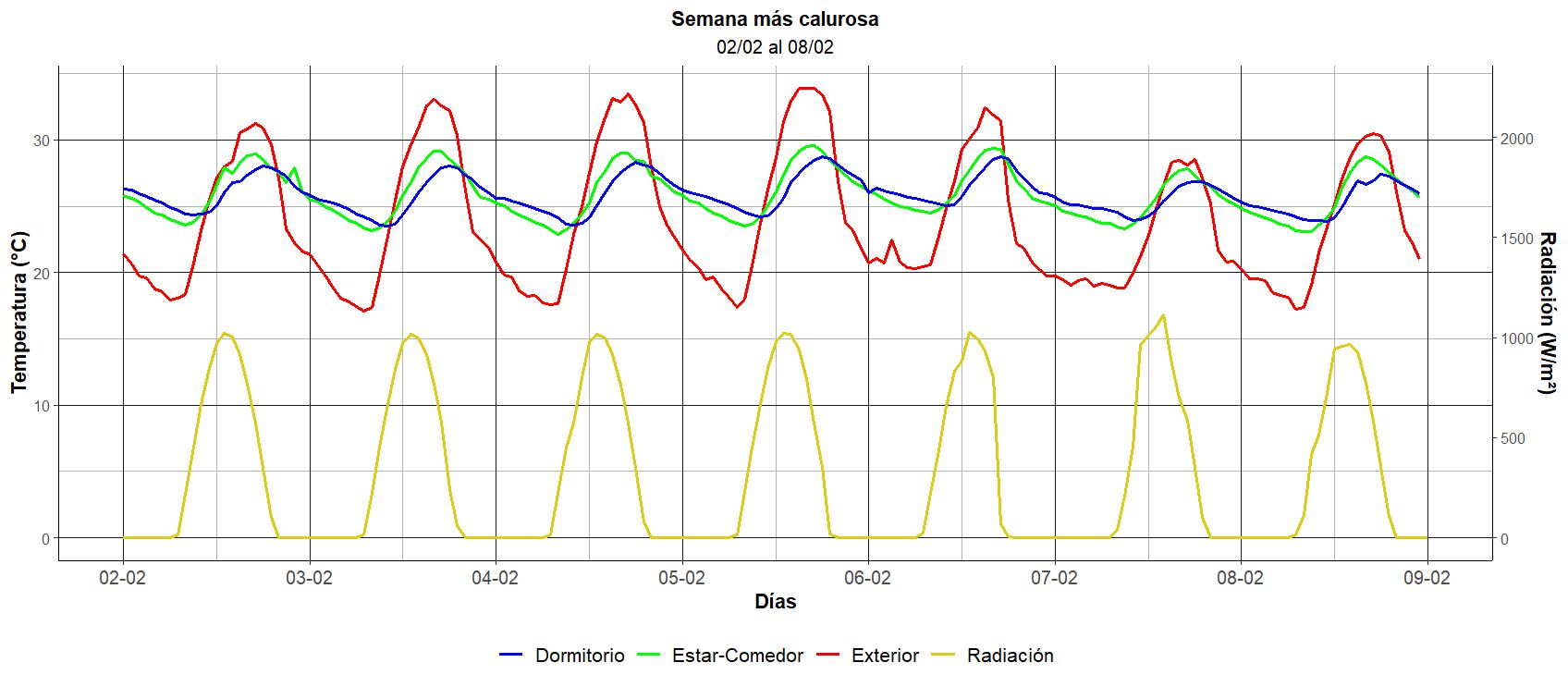 Figura 12: Periodo del 2 al 9 de febrero de 2025. Datos de radiación, temperatura interior y exterior. Temperatura más alta registrada en verano (33,89°C) registrada el 5 de febrero a las 15:00:00.Discusión