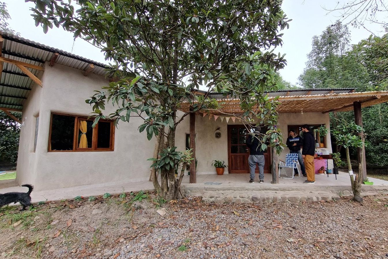 El techo apoya en los muros perimetrales de la vivienda y fue realizada con tirantes de eucaliptus, cielorraso de machimbre, aislación térmica y cubierta de chapa. La carpintería fue encargada a medida, es de madera con vidrio simple repartido. En la figura za se muestra el frente de la vivienda desde la orientación norte.