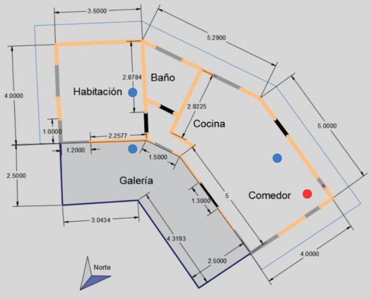 b) Croquis de la vivienda. En circulos azules; ubicación de los sensores. El círculo rojo indica la ubicación de la estufa. Fuente: elaboración propia.