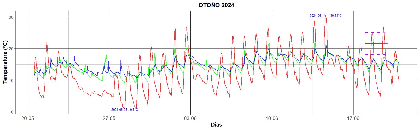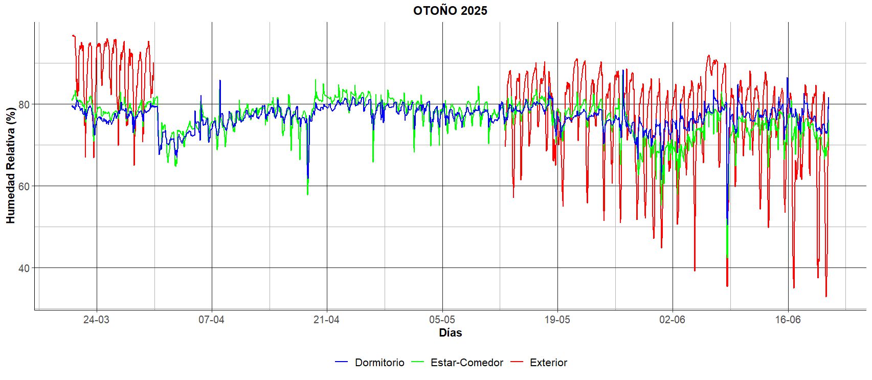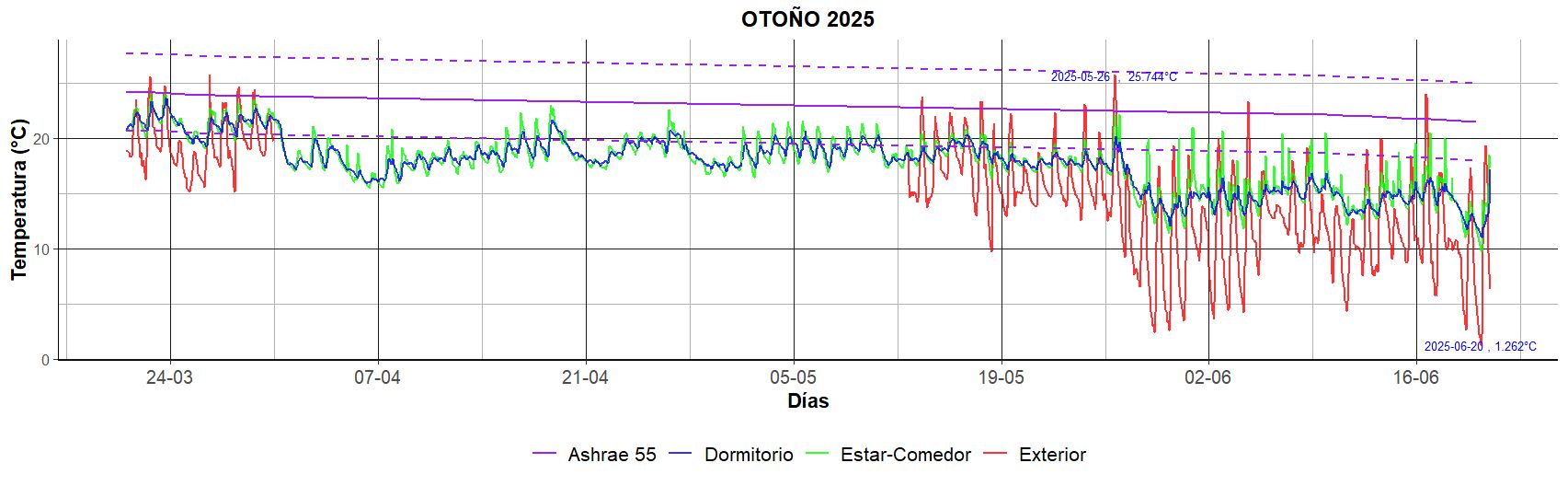 El periodo de monitoreo del otoño abarcó los meses de mayo-junio de 2024 y marzo-mayo de 2025. Como se observa en la Figura 3, se registró una interrupción en la recolección de datos en el exterior durante abril y parte de mayo de 2025. Durante el periodo analizado, la temperatura exterior alcanzó una máxima de 30,5 °C una minima de 0,8 °C. A pesar de esta variabilidad externa, las temperaturas interiores en el dormitorio y el estar-comedor mostraron un comportamiento similar entre sí, manteniéndose en su mayoría por encima de los 10 °C en 2024 y superando los 15 °C durante gran parte del otoño de 2025.