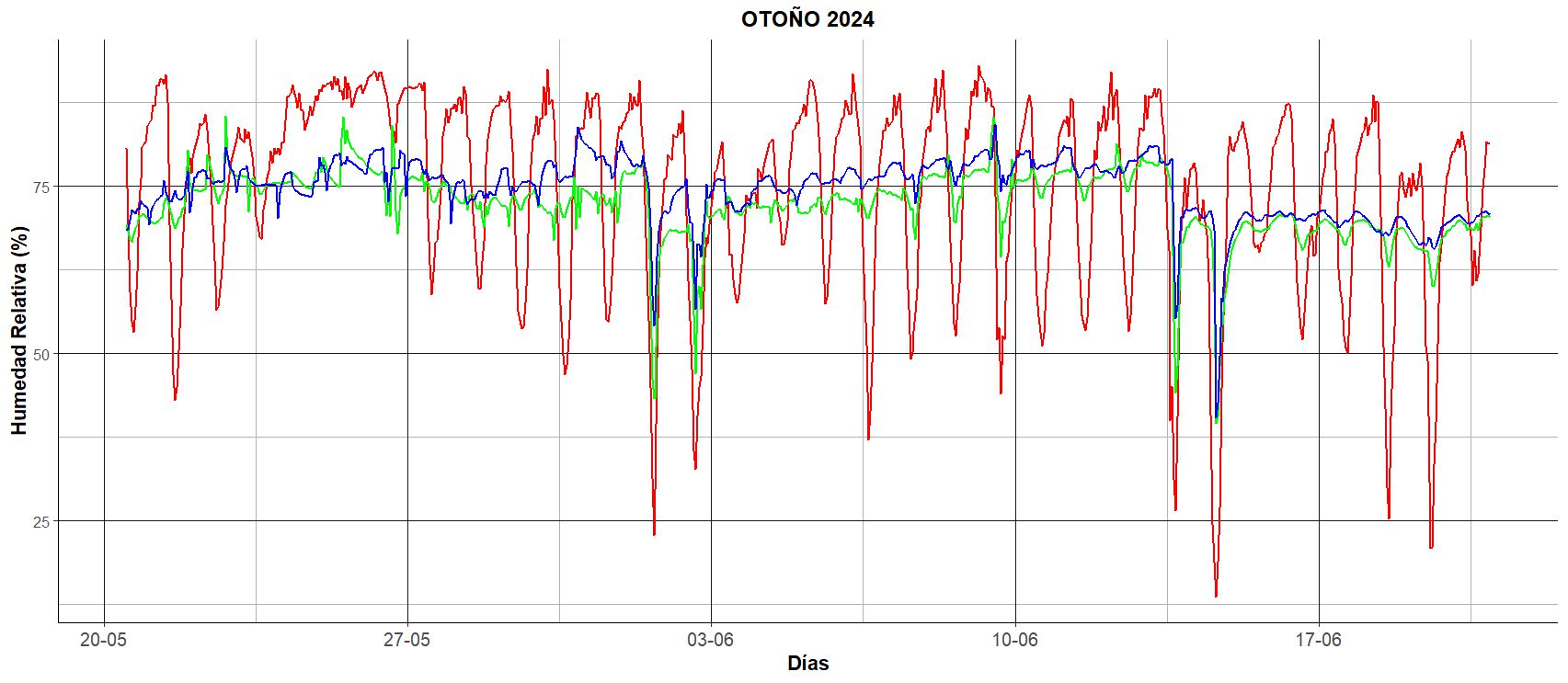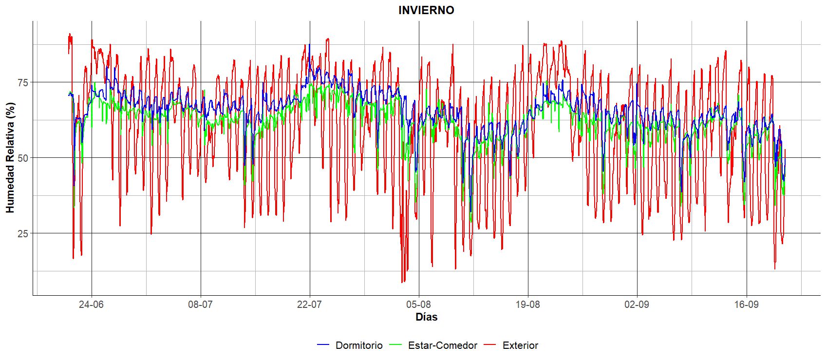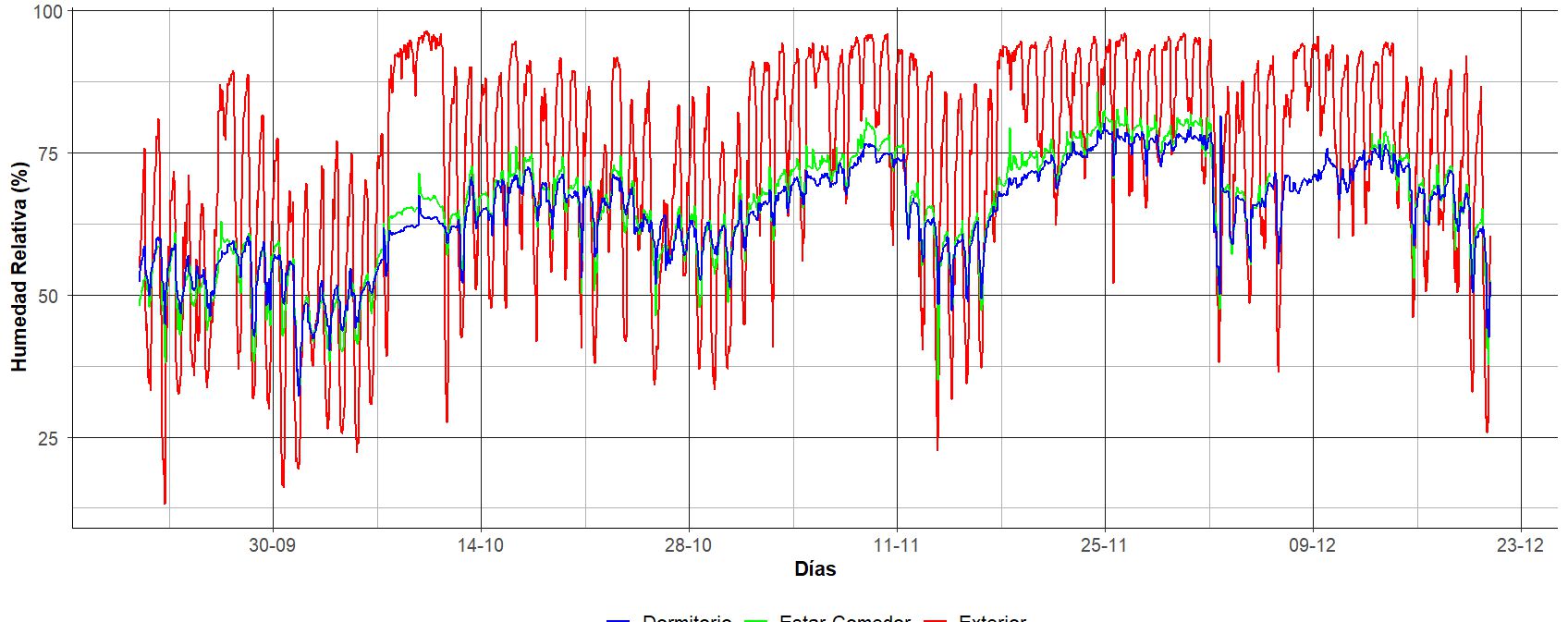 Figura 8: HR del exterior y de las distintas zonas del interior para el periodo del 21 de septiembre al 20 de diciembre.Comportamiento térmico en verano