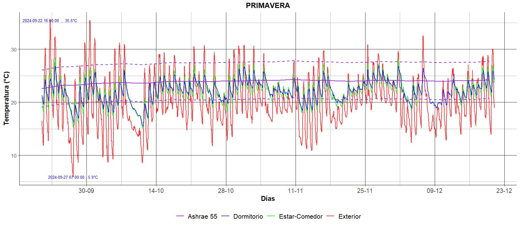 Durante la primavera, en el exterior se registraron 18 días con temperaturas superiores a 30 °C alcanzando un máximo de 35.5°C el 22 de septiembre, se registraron solo 6 días temperaturas menores a 10 °C El rango de confort adaptativo ASHRAE-55 calculado fue de 22.6°C a 24,3 °C \( (T_{o,iprima})\pm3,5^{\circ}C \) La figura 7 muestra que las temperaturas interiores de ambas zonas se mantuvieron dentro de los límites de confort a lo largo de la estación.