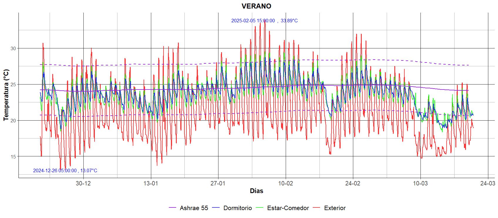 El verano fue la estación con el mayor porcentaje de horas en confort. La temperatura media diaria exterior osciló entre 15,6 °C y 25,0 °C, con 21 días en los que se superaron los 30°C El rango de confort adaptativo por Norma ASHRAE-55 se ubicó entre 24,0°C y 24.8°C ± 3.5°C (figura 9).