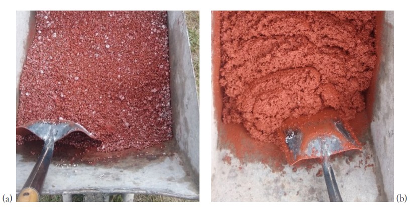 5°) Luego de unos minutos de mezclado introducir el agregado fino con un 10 % de agua de amasado. Ver Figura 2(a).