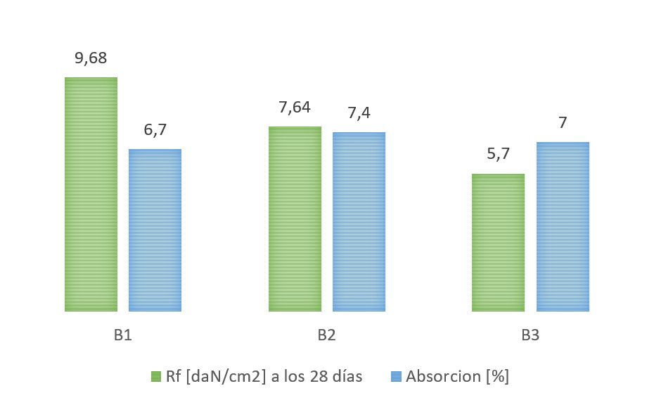 El gráfico de la Figura 5 se muestra los resultados de la resistencia a la flexión ordenados de mayor a menor resistencia a la flexión, siendo B1 la probeta de control. B2 tiene 9,5% menos de agregado fino y grueso que la probeta de control, mientras que B3 un 12% menos. La Figura 5 también detalla los porcentajes de absorción de las probetas. De acuerdo con los resultados de absorción de las tres probetas B1, B2 y B3 todas fueron menores al 10%, cumpliendo con la norma IRAM 1522.
