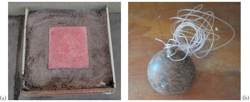 Figura 7. a) Caja de arena. b) Esfera de hierro para ensayo de choque.Para el ensayo de choque se utilizó una caja de 60 cm x 60 cm y 20 cm de alto, con 10 cm de alto lleno de arena mediana, Figura 7(a). Se arrojó una esfera (Figura 7(b)) de 650 gramos de hierro desde diferentes alturas hasta obtener la ruptura de las baldosas. Las dimensiones de las baldosas ensayadas son de 30 cm x 30 cm x 2 cm de espesor. La esfera de hierro fue arrojada desde nueve diferentes alturas comenzando desde los 30 cm hasta los 250 cm, altura a la cual las baldosas B1 y B2 se rompieron, Figura 8(a). Mediante el análisis de las Figura 8(a) y Figura 8(b) podemos apreciar la diferencia en las grietas de las baldosas, ya que la baldosa B2 no presentó una grieta continua ante el impacto final de choque, mientras que en la baldosa B1 la grieta fue continua y llego abarcar todo el largo de la baldosa, Figura 8(b). Esto se debe a los agregados de desechos plásticos y de EPS que fueron amortiguando al choque de la esfera de hierro.