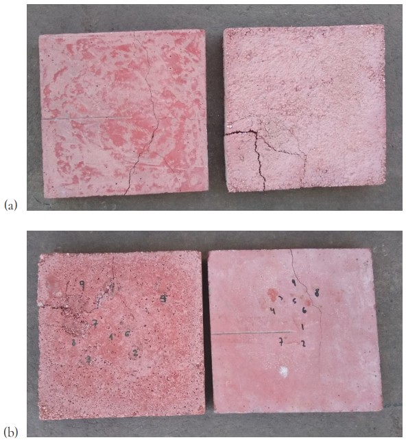 Figura 8. (a) Marcas de las caídas de la esfera donde a la izquierda esta la probeta B2 y a la derecha la probeta B1, (b) Diferencia de las grietas en las probetas al momento de la ruptura.