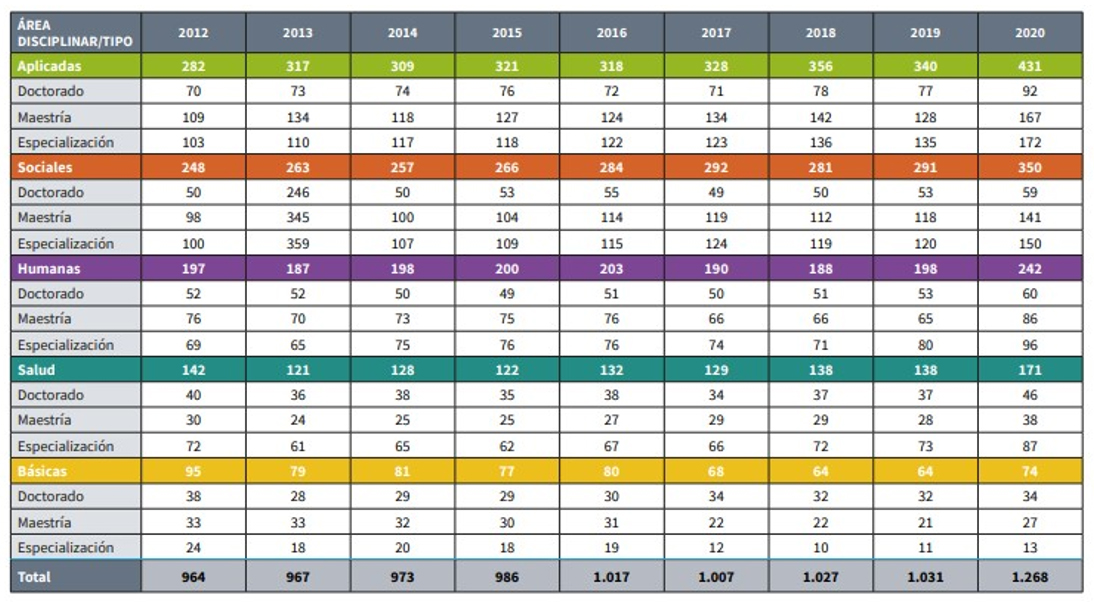 Si se toman en cuenta las áreas disciplinares, el crecimiento de la oferta se reitera en todas ellas con excepción de las ciencias básicas, la cual ha disminuido en un 20% desde 2012. Según la información obtenida de la guía de posgrados acreditados que publica la CONEAU, en 2020 las instituciones universitarias ofrecían 3664 carreras, mientras que la cantidad de posgrados que tuvieron estudiantes fue de 1268. Si bien las carreras no abren la inscripción todos los años, la cantidad de posgrados que tienen estudiantes (nuevos inscriptos y cursantes) en la secuencia de 9 años no muestra un crecimiento significativo, aun cuando existe un volumen importante de nuevas carreras que resultan acreditadas (un promedio de 180 posgrados por año). Los datos muestran la capacidad académica instalada en las instituciones universitarias para el desarrollo de formación de posgrado de calidad (por sus resultados en carreras en funcionamiento y en nuevas propuestas), que está disponible para el diseño de políticas que requieran de esa formación o que apunten a ampliarla (CONEAU, 2023, p. 42). Respecto a la graduación, los datos recabados por la ex Secretaría de Políticas Universitarias de la Nación muestran la siguiente distribución por áreas disciplinares: