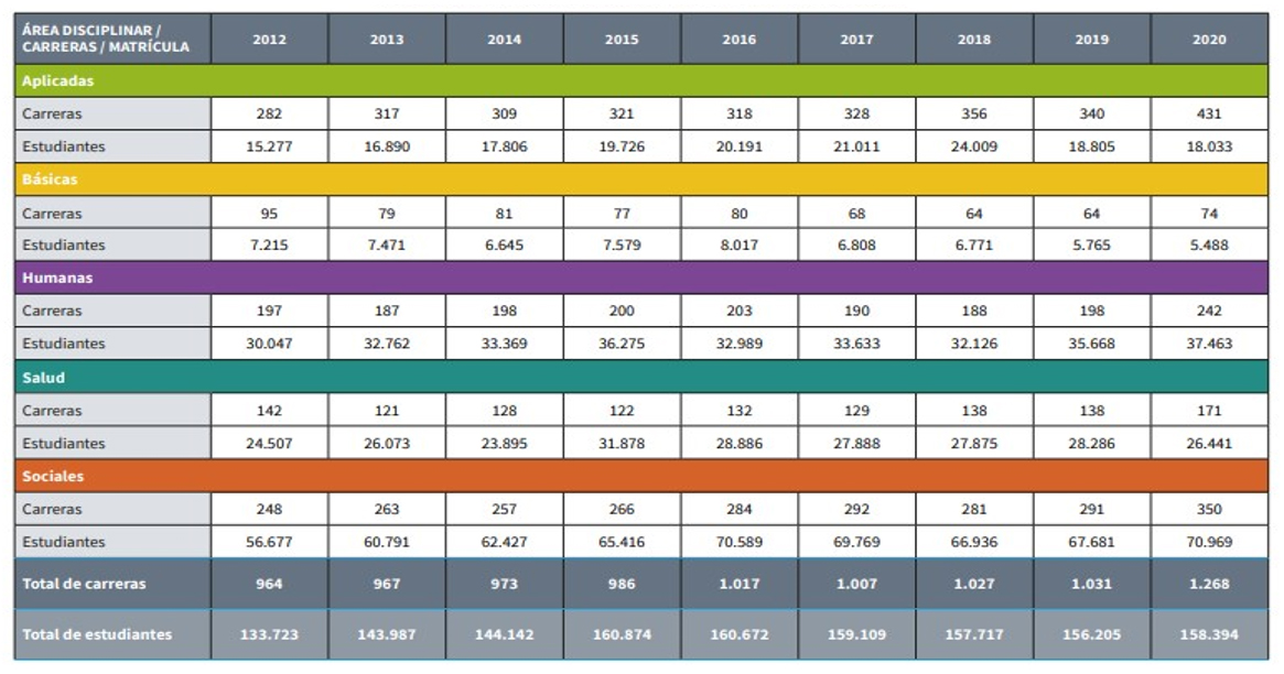Tabla 5. Matrícula y carreras entre 2012 y 2020 por área disciplinar