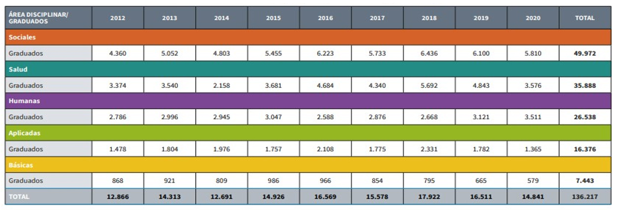 Como se aprecia en la tabla, la mayor cantidad de graduados se concentra en el área de ciencias sociales y le siguen en números los de ciencias de la salud, ciencias humanas, ciencias aplicadas y ciencias básicas. Por otra parte, si se consideran los graduados sobre la cantidad de estudiantes, pueden detectarse diferencias entre áreas.